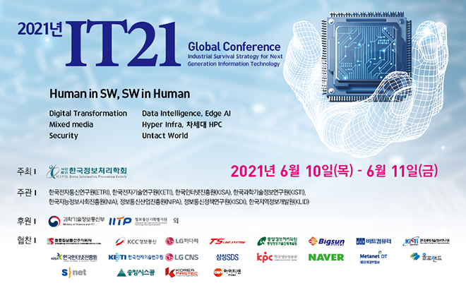 ● 2021년 IT21 글로벌 컨퍼런스는 COVID 19 사태로 인한 생활 속 거리두기에 적극 참여하기위하여 비대면 온라인 컨퍼런스로 개최합니다. ● 유료 등록자는 등록하실 때 입력하신 참가자명, 이메일주소를 입력하면 행사 기간동안 온라인 컨퍼런스에 입장하시어 실시간 온라인 컨퍼런스에 참관하실 수 있으며, 발표자료(pdf)를 다운로드 받으실 수 있습니다. ● 행사 기간동안 온라인 행사 참가를 원하시는 경우 행사 홈페이지(https://it21.kips.or.kr)의 'On Air' (or 행사생중계) 메뉴를 이용해 주시기 바랍니다. ● 참가증명서 발급은 유료등록자에 한에 발급 가능하며, 발급 신청은 행사 종료 후 참가자명, 소속, 연락처를 기재하시어 학회 담당자( joo@kips.or.kr ) e메일로 신청해 주시기 바랍니다. ● 본 행사의 콘텐츠를 허락없이 제3자에게 무단으로 복제, 배포, 전송하는 행위를 할 경우 민․형사상의 책임이 있음을 유의하시기 바랍니다.